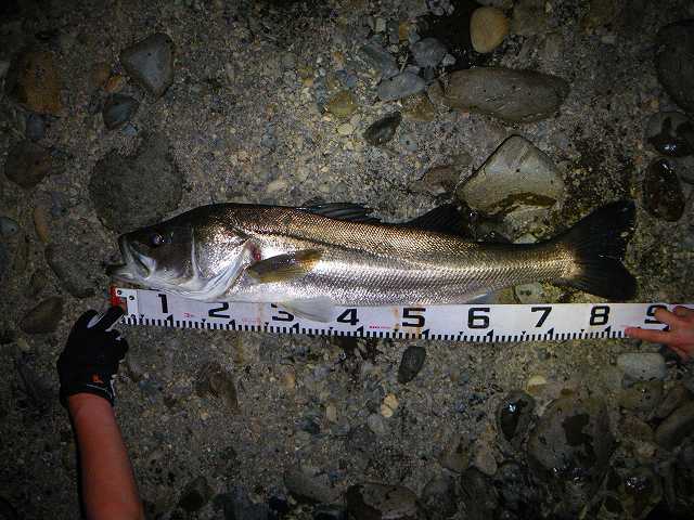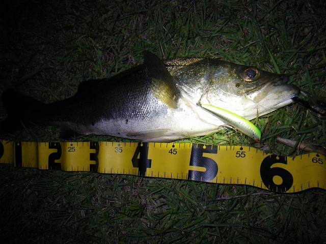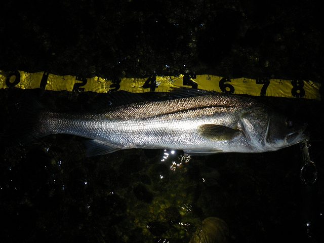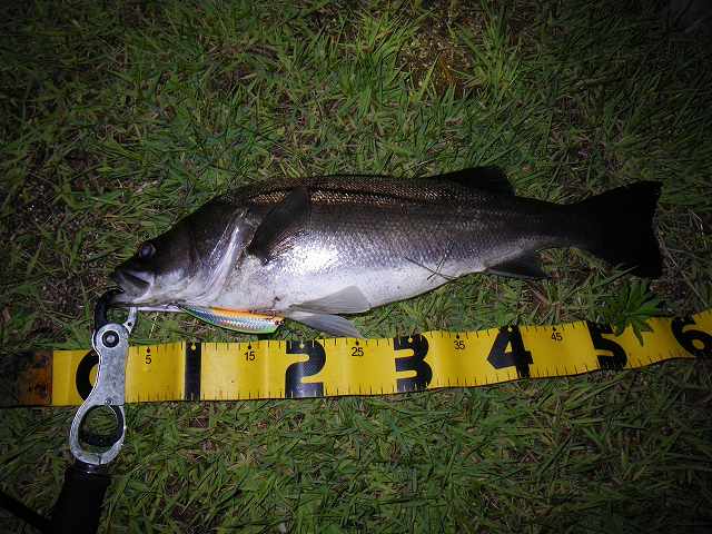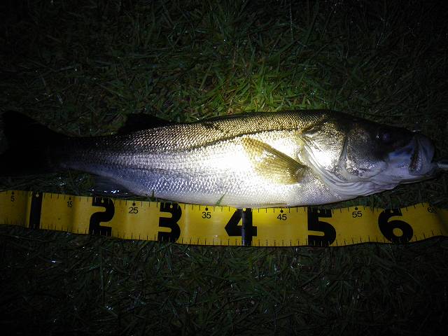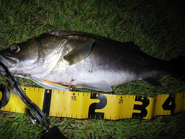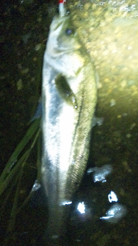 実は今日、会社の健康診断がありました・・・。 まだメタボではありませんでした♪ か・かろうじて・・・。 そんなこんなでちょうど夕方、雨が上がったタイミングに 昨日のメタボシーバス(親サイズ)を求めてポイントTへ・・・ しかし、打てども打てども反応がありません。 昨日とは打って変わって状況が渋い・・・ 昨日との違いを自分なりに考えながらルアーローテ そしてたどり着いたのが昨日の最後のHITルアー! 気がつけばポツポツ小雨も落ちてきて それと同時にボクのヤル気も落ちてきて 秘儀・無気力リトリーブ!! で、 「コン!」 決してガリガリ君では無いですが 昨日の激メタボ、見てるからな~ まぁ・・・。 でも粘って取った1本。 まぁ、これはこれで満足としよう!!
