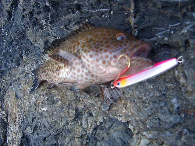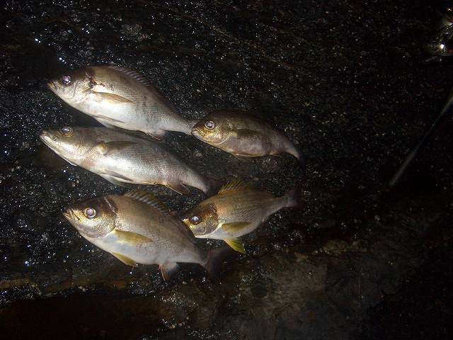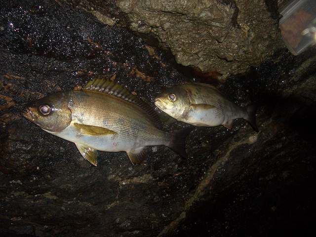直前までジギング修行へ行くか。 親父と沖磯へ行くか。 と迷いに迷った挙句、単身ジギング修行は寂しすぎるので沖磯へ・・・ 土曜日の昼前に家を出発し鶴見に到着!! 明日(日曜日)は鶴見のお祭り、豊漁祭らしく漁船がデコられているなか いつもの正幸丸にて出船!! 今日は始めてのナイター 1時過ぎに沖磯へ着き迎えは翌日の朝!! と、言う事は 20時間近いLONG RUN!! まずは御ヒラ様を釣るべくシーバスタックルを片手に沈み瀬をトレース・・・ 出ない>< すると親父がエギングにてイカGET!! 釣れない魚より釣れるイカ!! という事でエギングタックルに持ち替えキャスト♪ 1投目GET!! しかも先週より若干大きいではありませんか♪ 立て続けに3杯GETしまたまた御ヒラ様へ^^ 上モノ狙いの磯の為水深がかなりあり、フローティングでは中々出てくれない・・・ シンキングミノーに替え遠くにある瀬の横をトレースさせてみる 「コンコン!」 合わせを入れると同時にリールを巻く^^ 「ビヨ~~ン」 とジャンプ→即バラし・・・ さすがに同じコースでは出ないのでレンジバイブに替えて違う瀬を目掛けトレース すると 「コツコツ・・・」 絶対バラしたくないという気持ちから大きく合わせをいれると またまた 「ビヨヨ~~ン」 とジャンプし即バラし>< 夕刻が近づいてきたので船長が話していた10㎏クラスのブリの回遊に期待し キャスト!! 着底させしゃくっていると 「ゴン!!」 HIT!! シーバス用ドラグのままだった事を忘れたままやりとりをする 根に潜られる・・・ フックアウト>< でも引きからしてブルーでは無かったのは確か! だけど悔やまれる・・・ ドラグを締め再びキャスト!! 同じように底からしゃくっているとまたまた 「ゴン!!」 きついドラグでゴリ巻き! でもさっきより小さい で、上がってきたのはこの方!! デカカサゴかと思ってよ~く見てみると どうやらハタ^^ 初めて釣った^^v その後ジグには反応が無くなり 再度エギング!! 立て続けに5・6杯GET♪ どれも200~300gの食べ頃サイズ^^ ここで疲れを感じしばし休憩&睡眠・・・ ふと目が覚め 今まで夜のフカセであまりイイ思いをした事は無かったが なぜか 「フカセでイサキ釣りて~♪」 で 親父のフカセタックルを拝借しコマセを打ちながら流を観察。 いきなりHIT!! しかも立て続けに・・・ まさに入れ食い^^ エサ釣りですが何か・・・?? 一人ではしゃぎながら4,5枚釣った所で 中々起きてこない親父を起こし 途中、20㎝近いアジも混じりながら 25~35㎝のイサキ、二人で20枚近くGET!! さすがに飽きたのでまたまた休憩zzz 「おい!!タモ!!!」 の声に起こされ寝起きのヨチヨチ歩きでタモを取りすくった獲物は またまたモイカ・・・ しかもまぁまぁのサイズ!! 朝マズメに親父と二人で10杯ほどGET!! 最後のチャンスタイムに御ヒラ様へ リ~ベンジッ!! 昨晩の学習を活かし ザブラバイブ!! 数投した所に 「コ・コツリ」 HIT!! 優しくそして強めの合わせを入れる 今回は 「ビヨ~~ン」 とジャンプ無し! ロッドに伝わってくる感触からしても昨日のベイビーサイズではない^^ が ちょっと寄せた所で嫌な感触と共にフックアウツ>< 御ヒラ様。 3HIT・ノーキャッチ・・・。 食いが浅いのかバイトもすごく控え目なこの日の御ヒラ様にリベンジを誓い STOP FISHING. 港に帰ると多くの人で賑わいを見せる 「豊漁際」 祭の恩恵を受けたのかは定かではありませんが クーラーの中は イサキ20・モイカ20・アジ10・そしてハタ^^ ここに御ヒラ様とブルーに光るブリがいないのは残念ですが LONG RUN 完走^^