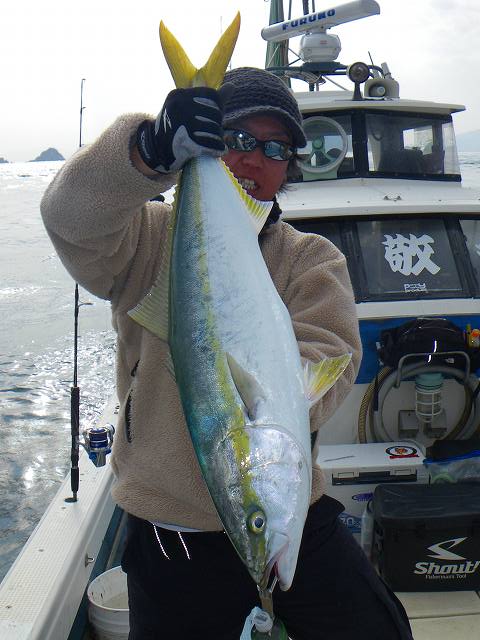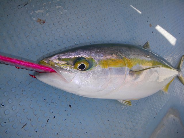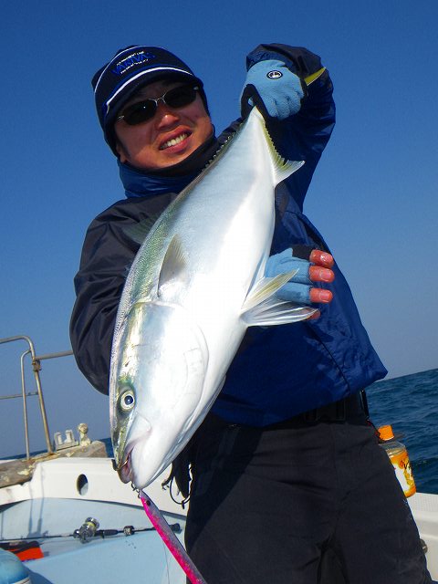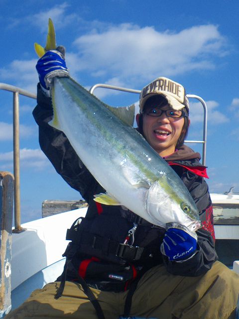 約2ヶ月ぶりのヒロタカジギング!! 崩れかけていた天候も何とか持ち応えてくれたので 出船です!! まずは、朝一の流し~ 幸先良くHITです!!! しかし・・・ 釣ったのはボクではなく同船していたリョ~ガ先生!! 7kgクラスの丸太みたいなお腹をしたパンパンマン♪ 次の流しで次々と同船者の方達も 6,7kgのメタボハマチを釣上げていきます・・・。 そんな中・・・ アタクシ、完全に乗り遅れました><; 同船者の方にHITジグを教えてもらおうと ネットの中のハマチ君を見ると・・・ ん?! ぺろ~~~ん?! 口から太刀魚~~!! すぐさまジグを替え ヒ~~ット!!! 名カメラマンの腕で5キロUPに見えますが 先に釣れた魚の半分くらいの3kgクラス><: 気を取り直し 次の流しで連続HITに成功しますが サイズダウンのヤズ君でした・・・。 その後は次第に渋くなり潮も止まったので移動~ まだ潮が効いていないようなのでインチクで 高級魚を狙いますが全くアタリなし!! インチクしたりジギングしたり優柔不断な釣りをしていた ボクを尻目に 同船者の方がライトタックルで・・・ ハマチ~ ん?? 鯛ラバでハマチ~~~~ あまりにもアタリの無いインチクに飽き ジグをシャクっているとボトムで HIT!!!! しかし、手ごたえ的にヤズか~っと ゴリゴリ巻いて浮いて来た魚は インチクではアタりが無かった こ~~きゅ~~ぎょっ!!! しかも余裕で自己記録サイズの48cm^^v いぇ~~~い♪♪ 嬉しさのあまり、上げちゃいました(笑) その後もデカブリ男様を狙ってシャクリ続けましたが ジギングの・・・ 魚はいるのに口を使わせられない状況を打開できず しゅうりょ~~~~です!! タフコンディションの中 お疲れでした~~~♪