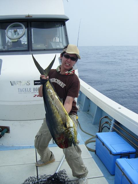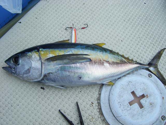 待ちに待った日がやってきました^^ そう浩敬丸ジギング!! 心配された前日までの風も治まりスゴクいい天気の中スタート!! 2流し目! バタ!バタ!!バタ!!! と右舷連続3人HIT!! あれれ・・・・ オレ、抜かされてるよね>< 船長曰く、群れが変わったらしく 船内3,4kgと小粒ながらも ポツポツ釣れている も!! ボクのロッドは 午前の一発目、弧を描くことはなく・・・ 潮止まり そして船長 「潮が動き出すまで鯛ラバでも!ジギングの人は動き始めの一発狙えるよ!!」 で気分転換に マジギングタックルに疲れたボクは この日の為に用意した 鯛ラバ、インチク仕様のライジギタックルに持ち替え ジグ投入! さすがに110gのジグでは底取りに時間がかかり やっと着底・・・ ダイワ釣れるDVDで覚えた ワンピッチジャーク→ツーピッチのコンビネーションを 加えた瞬間 「ご~~~ん!!」 予想外過ぎるHIT!! なにせ、PE2号にリーダー30ポンド ロッドは鬼ブチ曲がり 締めこんだリョーガのドラグも ジリジリジリ・・・ 巻いては出され、出されては巻いてを繰り返しながら か~~なり時間を掛けてGET!! 3,6kg^^ 大物ではなかったけどライトタックルでは ランカー気分♪♪ この一本で両腕パンパン>< 少し休みながらマジギングタックルに持ち替え ズーヤーを追加! そして数箇所ポイントを行ったり来たりしている中 一緒に乗っていたかぼさんHIT!! 本日最大の5kgクラスを底付近で掛け 疲れ果て赤ちゃんだっこ(笑) そして この後、数十分間、戦意喪失(笑) この時点でボク2本に対して、かぼさん4本 さすが腕の違いを見せ付けられます。 その後も船内、同サイズが上がる中 マジギングタックルで中々食わすことが出来てないボク・・・ 周りのHITしている人を観察・偵察しながら ジグを替え、シャクリ方を替え色々試します・・・ そして 今までより気持ち大きめにシャックっていると 一瞬 「ふわ~~」 とテンションが無くなり次のシャクリで 「ごーーん!」 サイズは同じく3kgクラス この一本を皮切りに 連続HIT! と思われたが乗らず 直ぐにフォールし同じようなタイミングで 「どーーーん♪」 連続HIT!! 2連続HITでついに両腕がMAX疲労>< その後バイトは数回ありましたが フッキングには至らず STOP FISHING. イイ天気の下でほぼ一日中、休みなしで シャクった結果・・・ 3ハマチ+1ヤズ+両腕の疲労と背筋疲労(笑) 一日中楽しく遊ぶ事ができた事=プライスレス(笑) サイズは出なかったけど あ~♪♪ 満足♪満足♪ 帰りに 「TOPの方がサイズ出るよ~」 という船長の言葉に 即バイト!! 来週はトップゲーム 楽しんできます^^