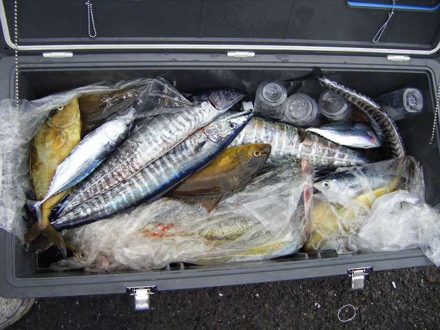 8・22待ちに待ったシイラ釣行!! が前日からの天気予報によると90%雨の予報。 ボクは、今回始めてのOFF SHOREで1からタックルを揃え準備万端! 前日、仕事を定時で終わらせKBさんと合流しTOPチヌへ・・・ 結果は3回ほど出たが乗せきれず日が落ちてきたので明日の祭りに向けての用意を 整えるべく某釣具屋へ・・・ その途中、Lさんよりメールが入る 内容は 「明日は予定通り出撃です!!」 待ってましたとばかりにテンションも上がり釣具屋へ 予約していたロッドとリールを受け取り OFFSOREルアーを物色! そこにHさん、明日の準備にたまたま来店のKさん、そしてNっちさんと 気がつけばシイラメンバー5/7名が集合。 それぞれ準備を済ませ早朝の集合時間までしばし待機。 家に帰り最終的なタックルの準備や飲み物の準備を済ませ早めの就寝。 仕事で疲れすぐ眠れるはずも 1時間・2時間経過するも中々寝付けない・・・ まるで遠足前の子供のよう楽しみで仕方ない。 「リリリーーーーーン♪」 大音量の目覚まし時計に起こされ時計を確認すると 3:30 とうとうこの時がやってきた^^ 早々と用意を済ませ集合場所に向かう HさんKBさんと落ち合い、ほかのみんなが集まるまでの間 しばしチニング(笑) そこでKBさん、初チヌゲット!! キレイな20CMのキビレ^^ そうこうしている間に全員集合で出発! 佐伯まで高速道路が繋がった事もあり、船着場まで1時間ほどで到着! みんなせかせかと用意を済ませ船長を待つ 待つ 中々来ない。 それもそのはず出船は8:00予定。 到着は6:30 昨年もシイラ釣りをしていた5人はすごく笑顔が溢れ 「待ち遠しい」 感じであったが 初挑戦のボクは楽しみと緊張で胸が張り裂けそうだった・・・ ボク達のあまりに早い到着に予定時刻より30分早く 7:30出船。 パヤオまで40分ほど美しい景色に癒され 大自然・大海原に比べると自分なんてちっぽけだな~なんて感傷に浸っていると ポイント到着!! 「いよいよだ!!」 先輩達が気を使ってくれ、シイラ初挑戦組3人がまず釣りを開始 早速OさんにペンペンHIT! も後が続かず次に移動。 OさんのHITルアーを見るとペンシル!ボクはホッパー 急いでペンシルに変えてキャスト! そして次の瞬間! 出た!! 船長、先輩方の「フッキング!!」 という声に反応し合わせを入れる!! 「ギギギーーーー」 ドラグを出される! シーバスでは味わうことの出来ない高速RUNに耐えながらFightを楽しむ しかしサイズはペンペンクラス・・・ その後も釣れるのはペンペンクラス そして4箇所目のパヤオでまともなサイズがHIT! キツく締めたドラグを簡単に引き出しながら 走る!走る! おまけに潜る(笑) 巻いては出されを繰り返しやっとこさ上がった来たのは 1Mあるか無いかサイズ シイラのファイトを十分に楽しんでサイズUPを狙う。 そんな中、Hさんに今日一の1M30~40クラスHIT!! 先ほどまでHITしていた魚のRUNとはドラグを引き出すスピードも桁違い!! 数分のFightでやっと浮いてきた魚体はナイスサイズ!! しかし、最後の力を振り絞ったLastRunに無念のフックアウト・・・ いつものシーバスに比べると爆釣だな♪ なんて思っていたボクの耳に飛び込んで来た言葉は 「渋い!激渋!!」 というみなさんの声・・・ それでも1つのパヤオで1HITを繰り返し、キャストできない人は空いた所でライトジギング!! シイラがダメでもシオ(カンパチ子)やカツオやサワラがコンスタントにHIT!! ボクもお土産確保にライトエギンジロッドに2000番のスピニングという超ライトタックルで豆ジギング!! するとロッドをバットからブチ曲げられドラグをガンガン出しながら走る魚HIT!! ライトタックルで楽しくやり取りをして上がってきたのは なんとマグロのお子様^^ もちろん人生初GET!! キレイな魚体に思わずニンマリ♪ その後 新しいパヤオに着くなり、まずはシイラロッドを片手に2・3回キャストし ダメだと分かると反対を向きライトジギング! 人一倍動き回り至福の一時を少しも逃すまいと船内を行ったり来たり^^ そして最後にMオーバーのシイラを釣って帰ろう!! とルアーを変え次のパヤオに期待を膨らませていると 「戻ろうか!」 という船長の言葉にSTOP FISHING 楽しい時間というものはなんてアッという間なのか 一日中動き回り、遊びまわり100%完全燃焼! そして本日のお土産達♪ こんな楽しい釣りに連れて行ってもらえた先輩方に心から感謝^^ 本当に楽しかった~~!!!! 正直な感想は・・・ 「明日も明後日も毎日行きたい!!」 です^^ みなさん、本当にありがとうございます^^ 唯一、心残りなのは余裕のMオーバー、デカシイラと出会えなかった事と 1シーズンに1・2回しか出撃できない事。 どなたか、今シーズンもう一度、 シイラ釣行行きませんか~~♪
